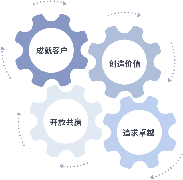 成就客户是一切决策的出发点,创造价值是衡量所有工作的标准,追求卓越是龙八国际做事做人的态度,开放共赢是龙八国际的格局也是最终的结果。价值观的齿轮环环相扣,推动着组织里的每个人不断向前。